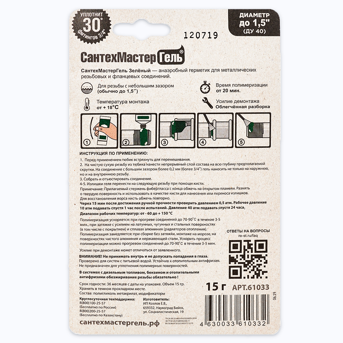 Данный гель-герметик разработан для труб диаметром до 1,5 дюймов. Соединение, собранное с использованием СантехМастер Гель Зелёный поддается легкому демонтажу без применения нагрева.