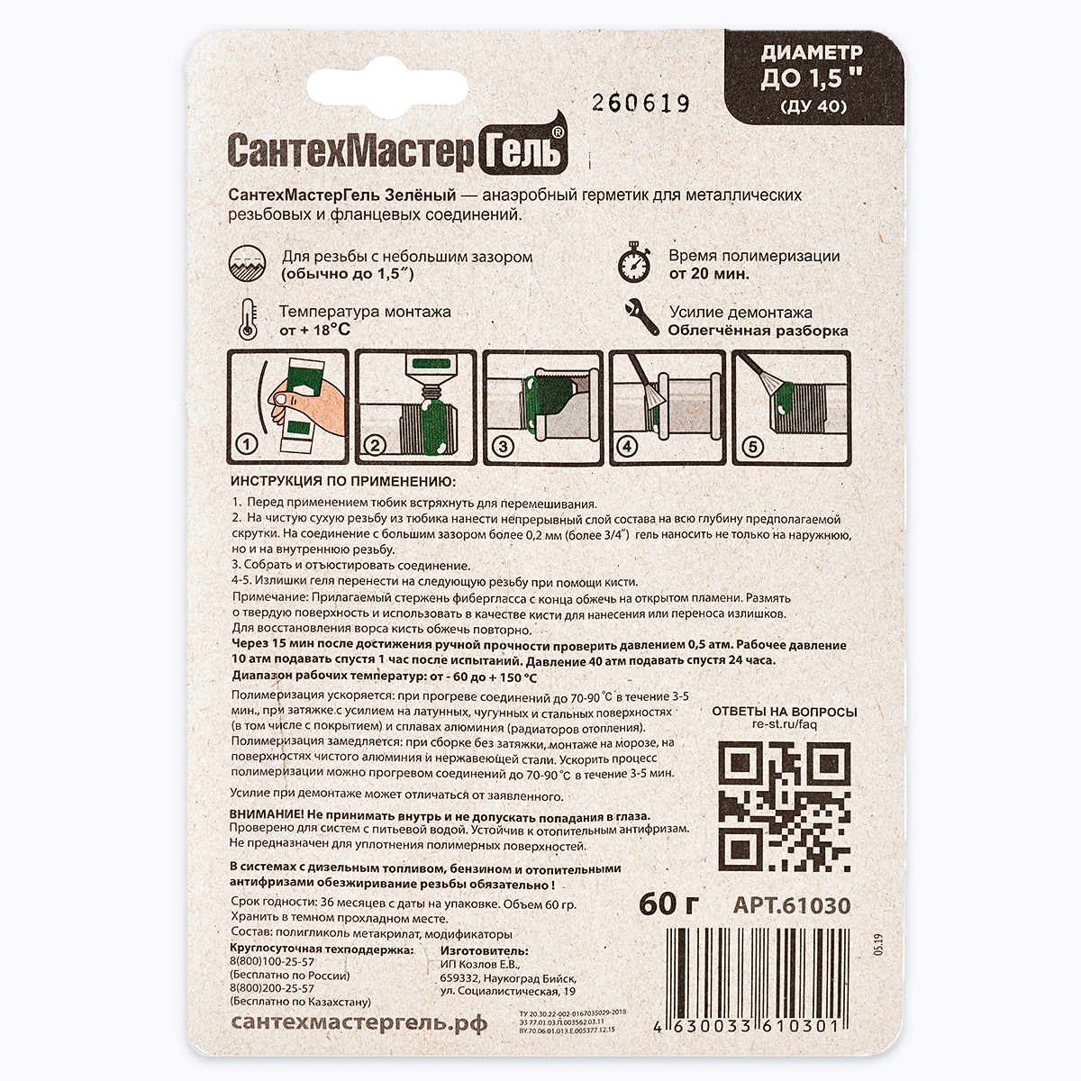 Данный гель-герметик разработан для труб диаметром до 1,5 дюймов. Соединение, собранное с использованием СантехМастер Гель Зелёный поддается легкому демонтажу без применения нагрева."