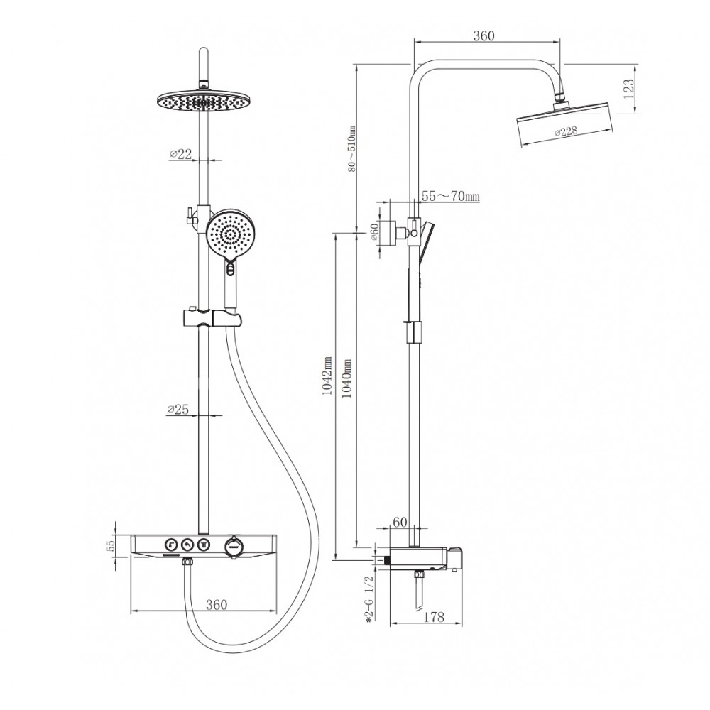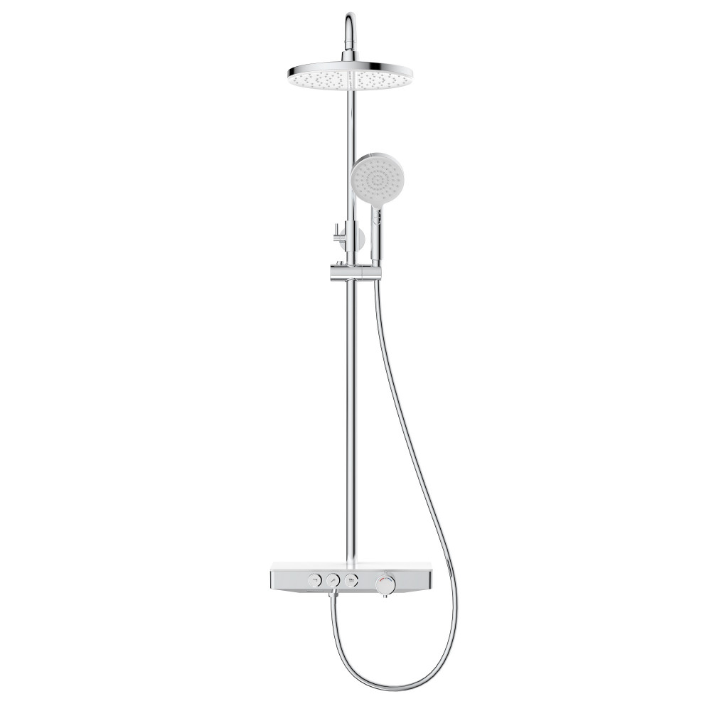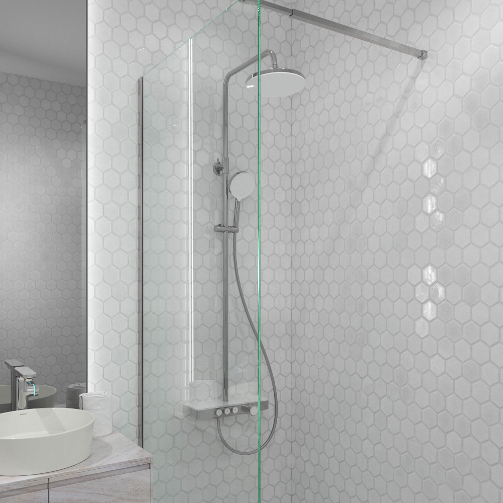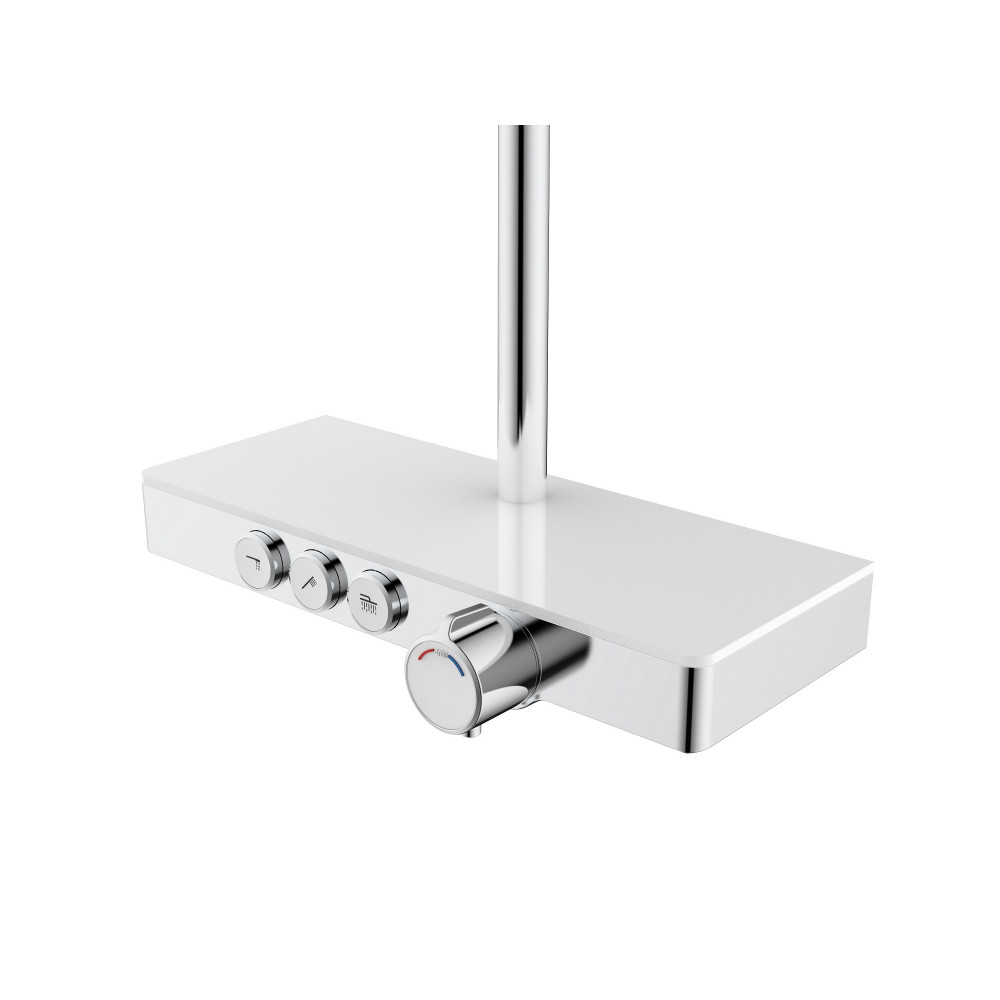Излив для наполнения ванны. Система оборудована термостатическим управлением, что позволяет поддерживать комфортную и неизменную температуру воды, а так же оберегает от ожогов. Верхний душ диаметром 25 см обеспечивает комфортное принятие SPA процедур, держатель верхнего душа имеет размер вылета из стены 40 см. Шланг для Ручного Душа выполнен из мягкого пластика длиной 150 см, что обеспечивает долгий срок службы, а так же гибкость, необходимую, для удобного применения. Форма корпуса смесителя выполнена в виде полочки из закаленного стекла, позволяя комфортно хранить необходимые принадлежности для душа. Регулируемая стойка выполнена из нержавеющей 201 стали с гальваническим покрытием. Душевая стойка BERGES MORANS совмещает в себе удобство эксплуатации и современный эстетичный дизайн, позволяя создавать красивое и