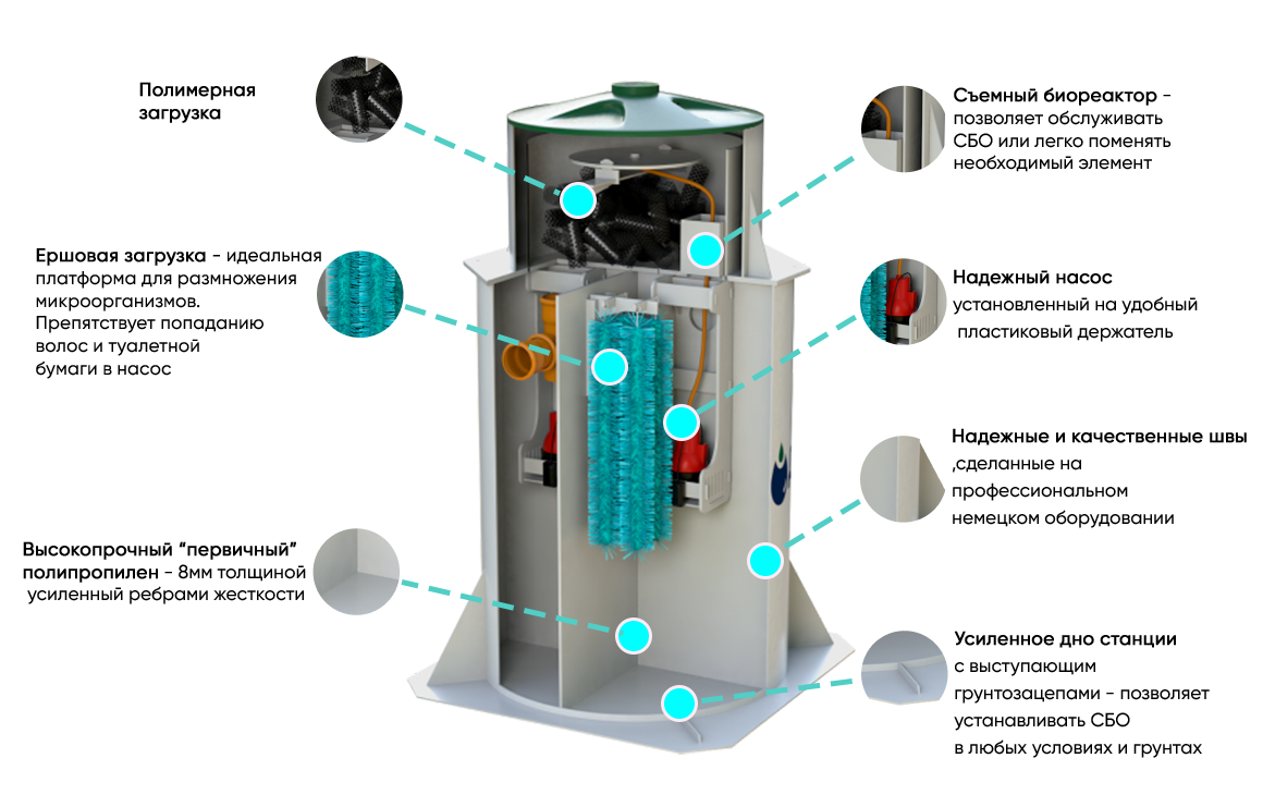 Удобство монтажа: Для удобства монтажа и обслуживания, станция укомплектована быстро съемными коннекторами для подключения насосов к элементам станции (система орошения биологической загрузки, принудительный сброс) полками для установки насосов, крепления для ершовой загрузки. Цилиндрическая форма станции равномерно распределяет давления грунта, что препятствует сдавливанию станции, дно станции оснащено грунтозацепами, что предотвращает выдавливание станции из грунта. Биозагрузка: Биозагрузка необходима для закрепления и размножения колоний микроорганизмов, которые питаются органикой, содержащейся в сточной воде. Система биологической загрузки полностью состоит из полимерного материла. Срок службы 50 лет. Ершовая загрузка: Биозагрузка необходима для закрепления и размножения колоний микроорганизмов, которые питаются органикой, содержащейся в сточной воде. Ершовая загрузка установлена во 2-й и 3-й камерах. Загрузка предотвращает попадание крупных органических включений в соседние камеры, по ходу движения сточной воды. Благодаря ершовой загрузке появляется дополнительная устойчивость микроорганизмов к ПАВам (химическим веществам содержащимся в моющих средствах), повышается стойкость к вымыванию и выживанию микроорганизмов в зимний период и период консервации станции. Технические характеристики: Производительность, м3/сут 1600 Залповый сброс, (л) 500 Вес, кг 170 Потребление эл.энергии, кВт 0,4 Габаритные размеры (A х B х H) мм 1500 х 1500 х 2050 Стандартная высота горловины, мм 500 Входное отверстие, мм 710